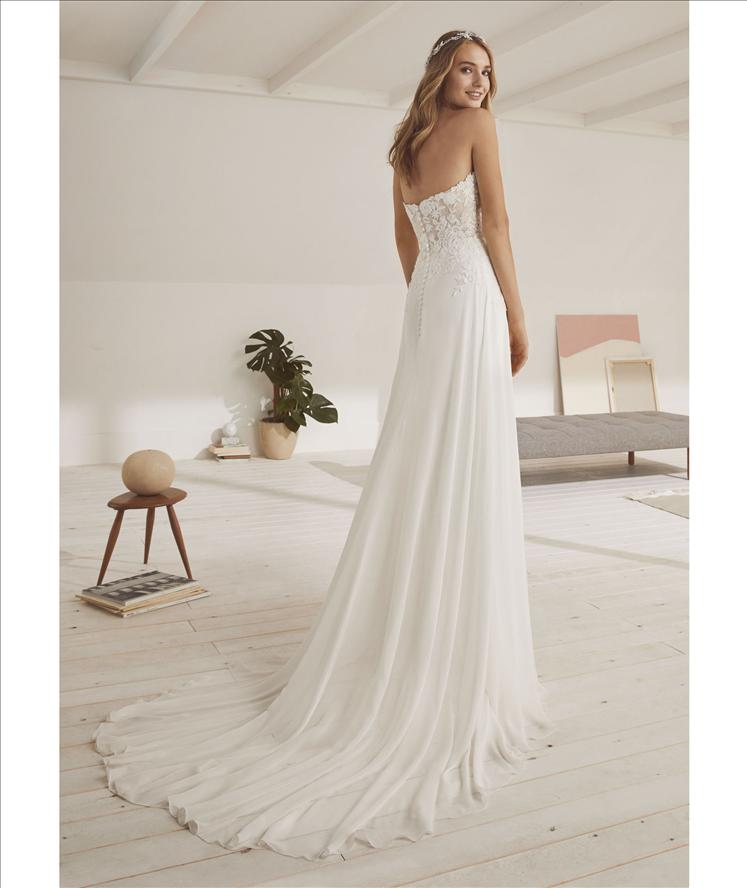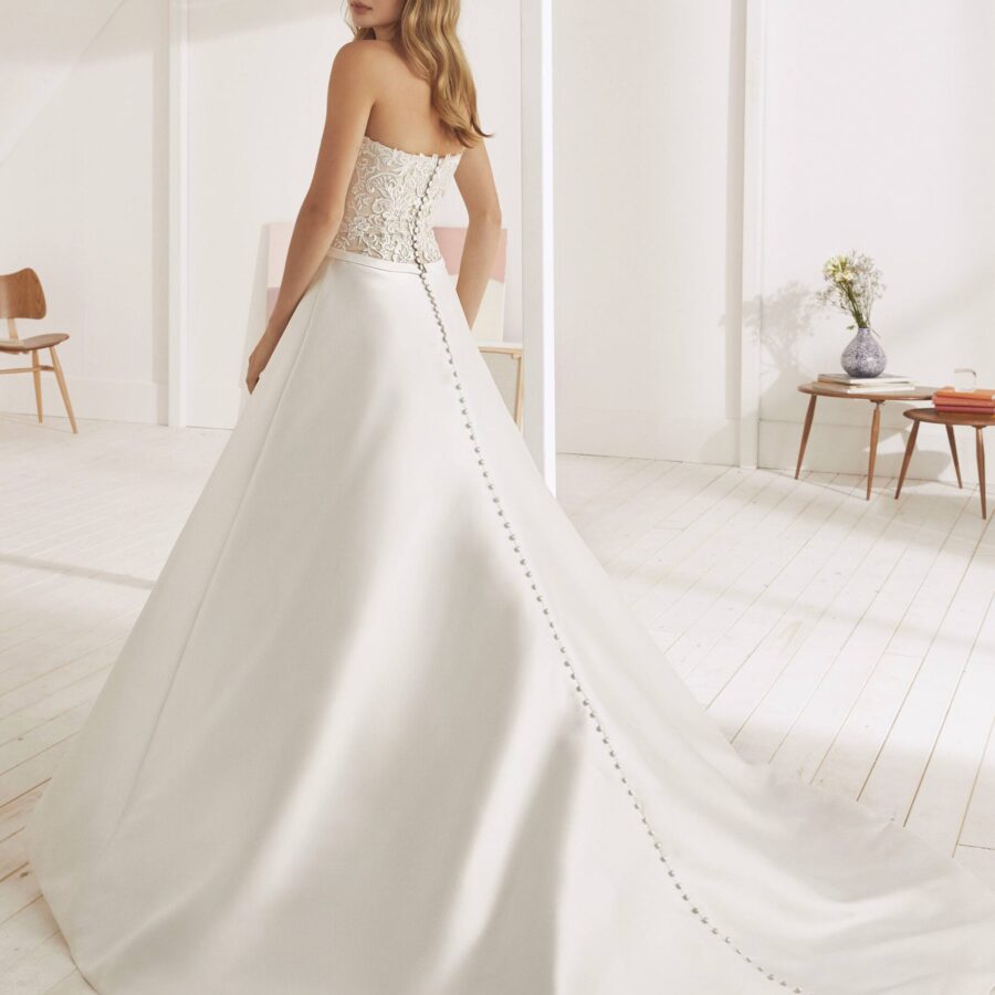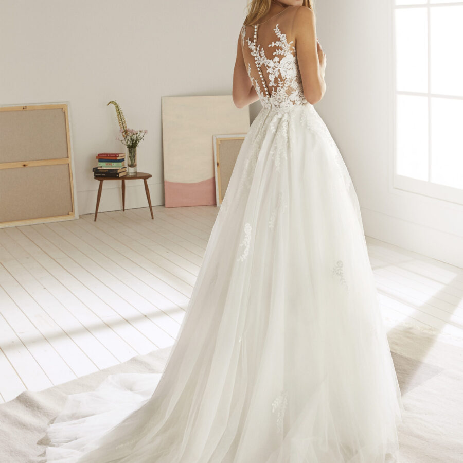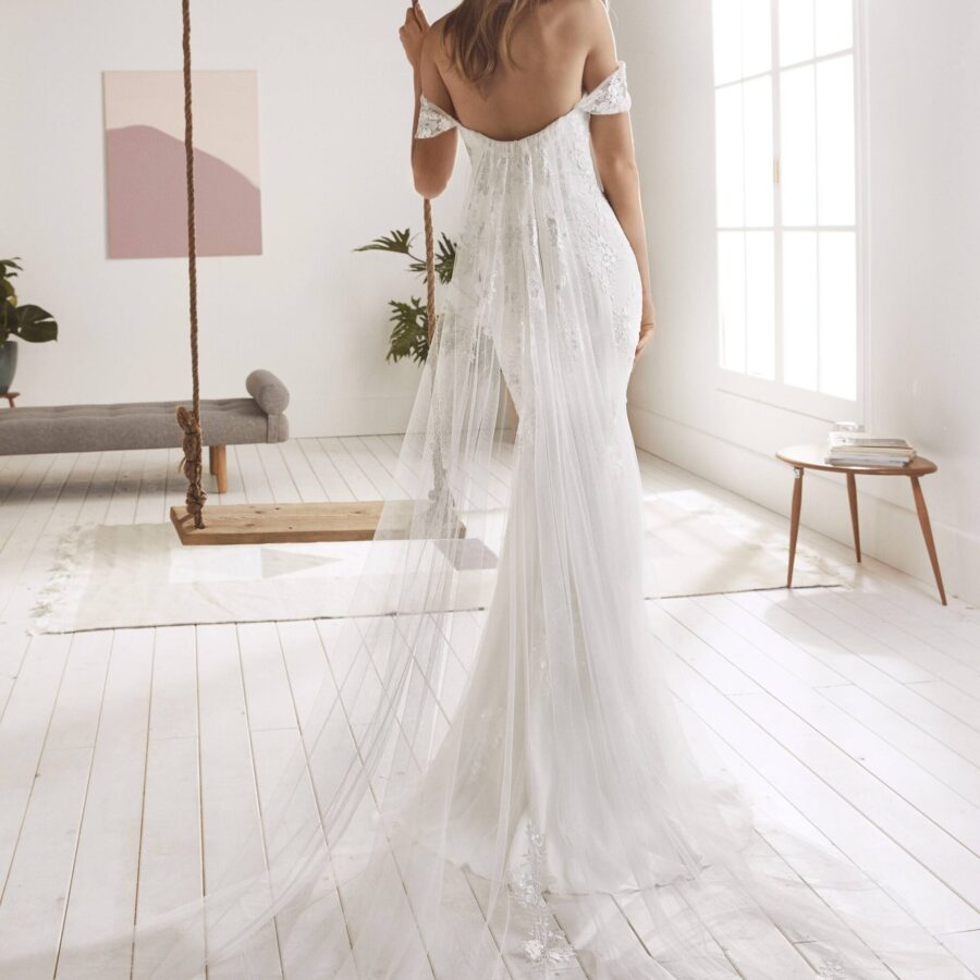 $1.00La robe de mariée OROPESA est une robe de mariée princesse qui est idéale pour votre future cérémonie. Avec l’effet fondu sur la peau suggéré par la transparence du bustier, la mariée aura une silhouette très féminine. L’immense traîne en tulle en bas de la robe donnera un vrai volume qui mettra réellement en avant…