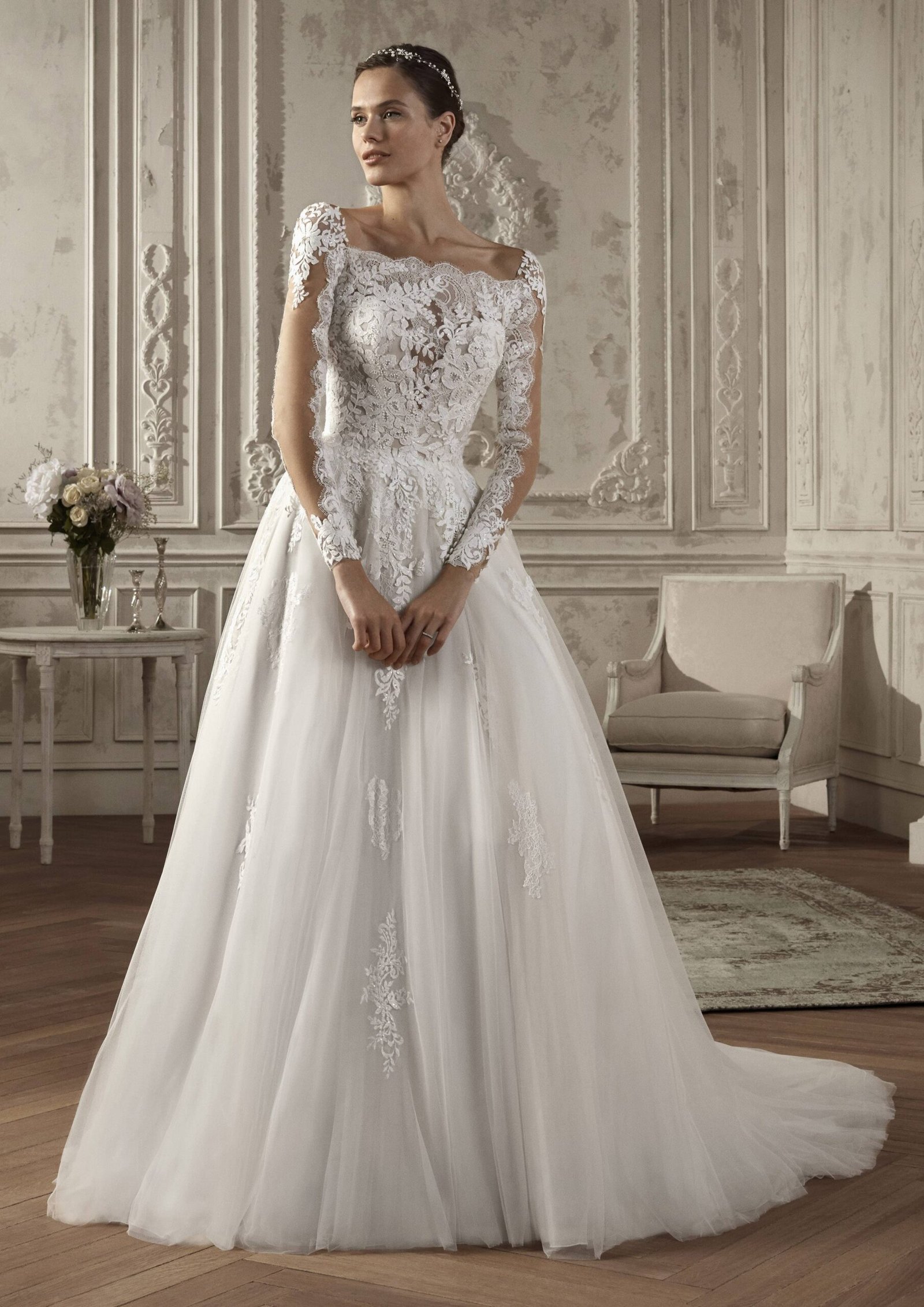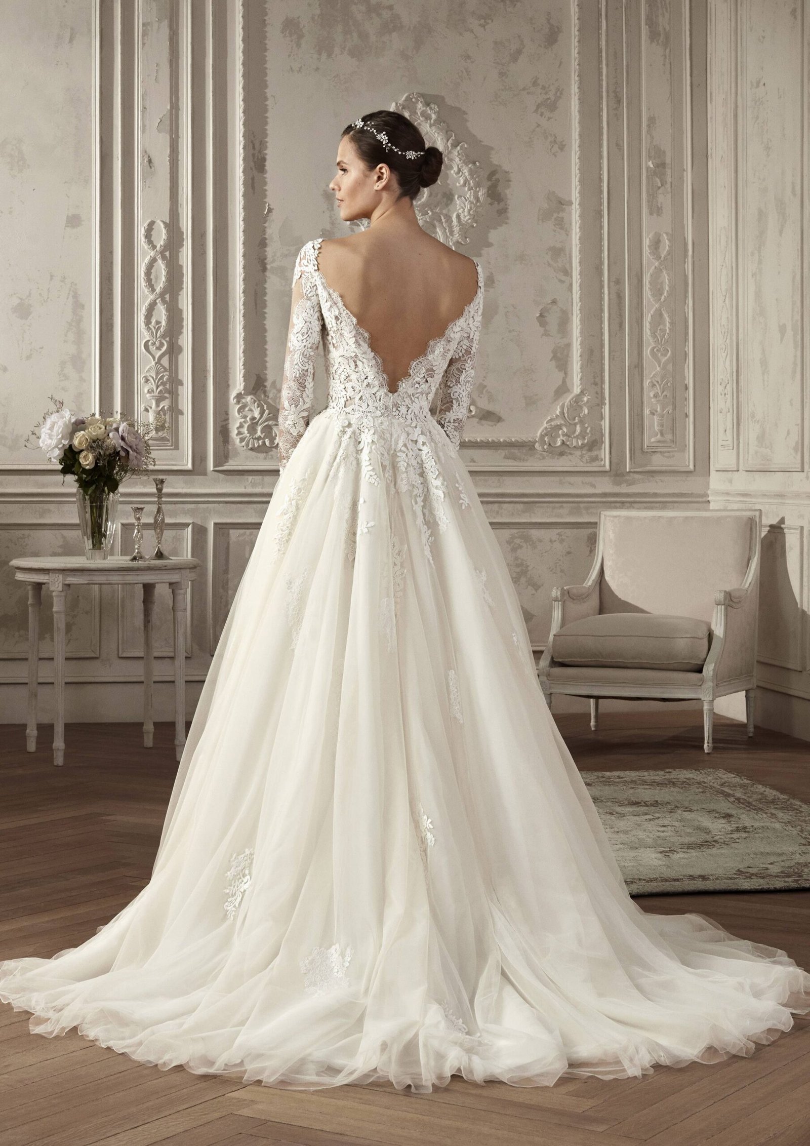 La robe de mariée ALQUIMIA est une robe de princesse sur-mesure qui immergera la mariée avec grâce inégalable. Son bustier tout en dentelle, avec le charme des manches en transparence, vient contraster merveilleusement avec le bas volumineux emblématique de la coupe princesse.