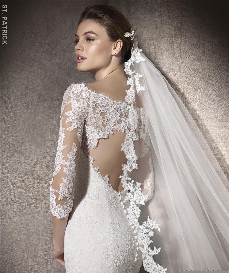Robe de mariée « San Patrick » modèle MACEDONIA, coupe sirène, en dentelle et crêpe.